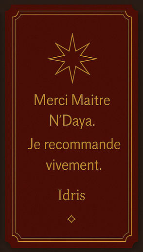Maître N’Daya est un puissant voyant marabout reconnu en France, héritier d’un savoir ancestral transmis de génération en génération. Grâce à ses dons spirituels exceptionnels, il accompagne avec sérieux, bienveillance et efficacité toutes les personnes en quête de solutions profondes dans leur vie.